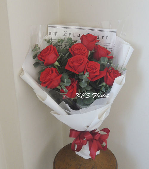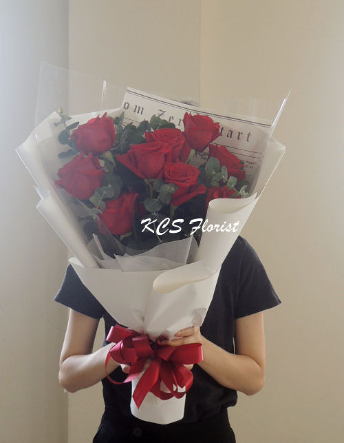 商品花材: 9朵進口玫瑰Imported Roses、尤加利葉 注意事項: 1. 其他顏色玫瑰、特殊色(藍色、染色....等) 價格另計 2. 進口花材需在送花前5~7天完成訂購與付款,臨時需求請先聯繫