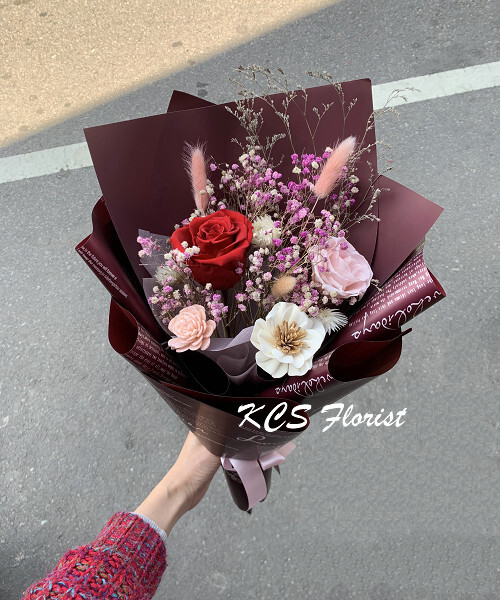 商品花材:永生玫瑰 Preserved roses、乾燥花Dried Flowers、索拉花 Sola flowers